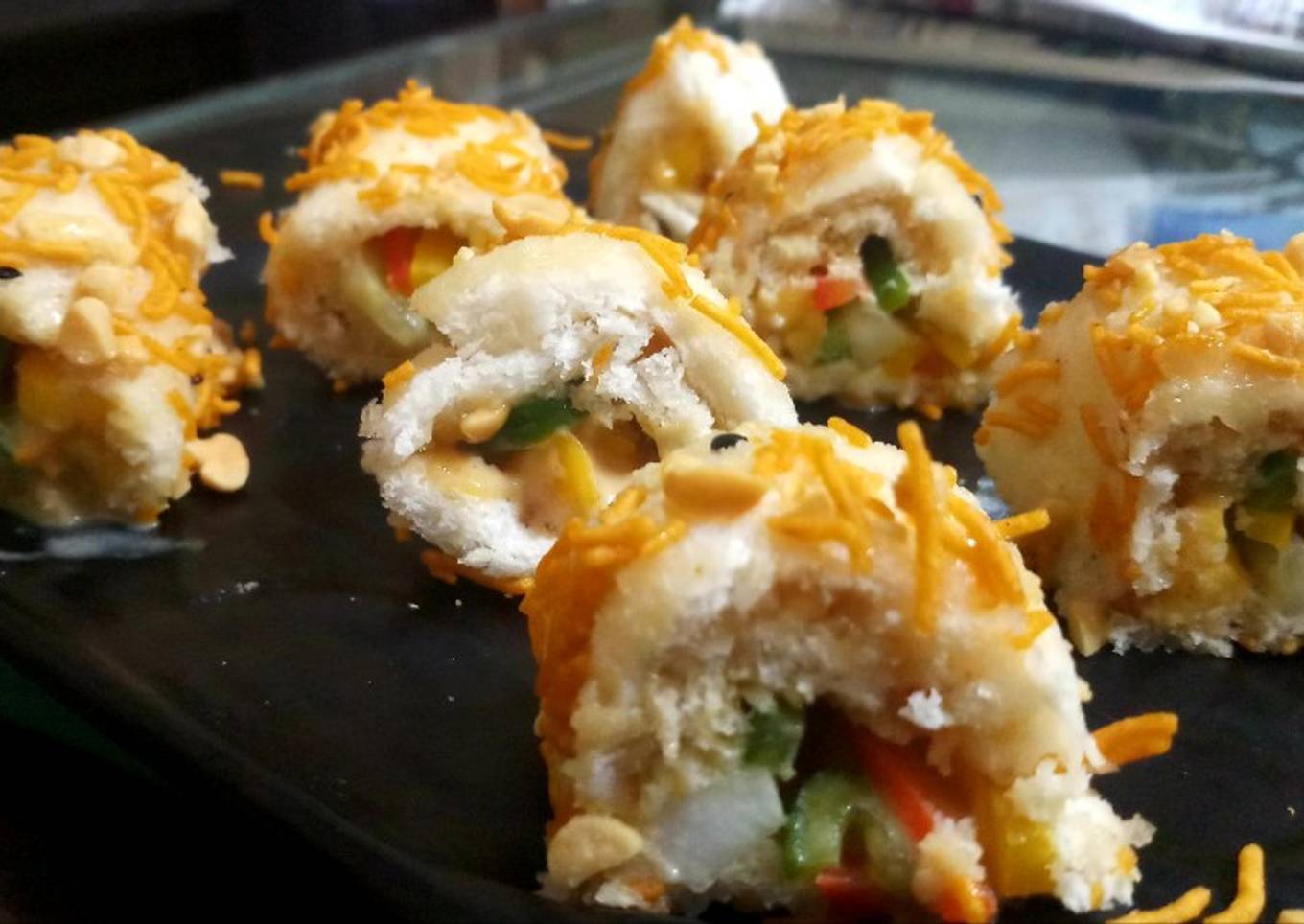 - Now in a plate add crushed peanuts and bhujia separate now Roll the bread in sweet onion sauce and peanuts bhujia mixture cut in to pieces and serve it