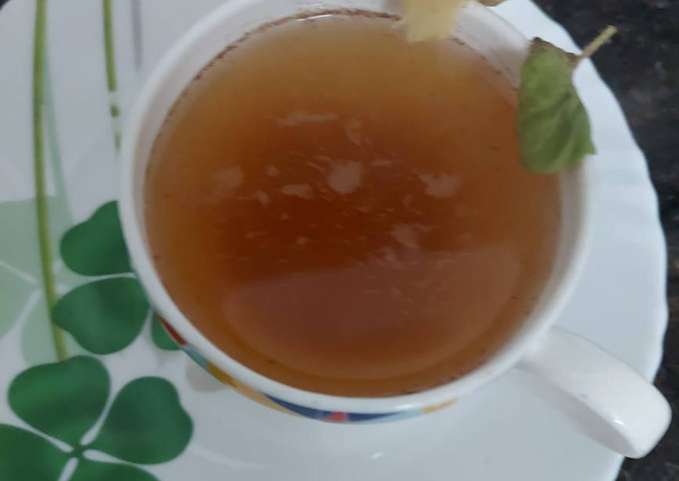 - Now herbal tea is ready to serve hot. Garnish with tusli leave and cut piece of ginger.