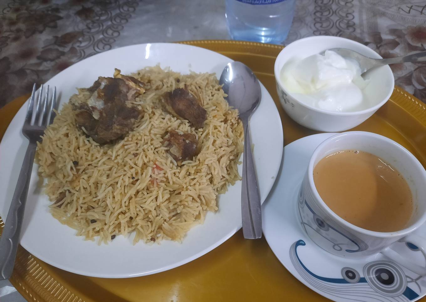 Instructions to make to make Mutton Yakhni Pulao. With dehi and Tea