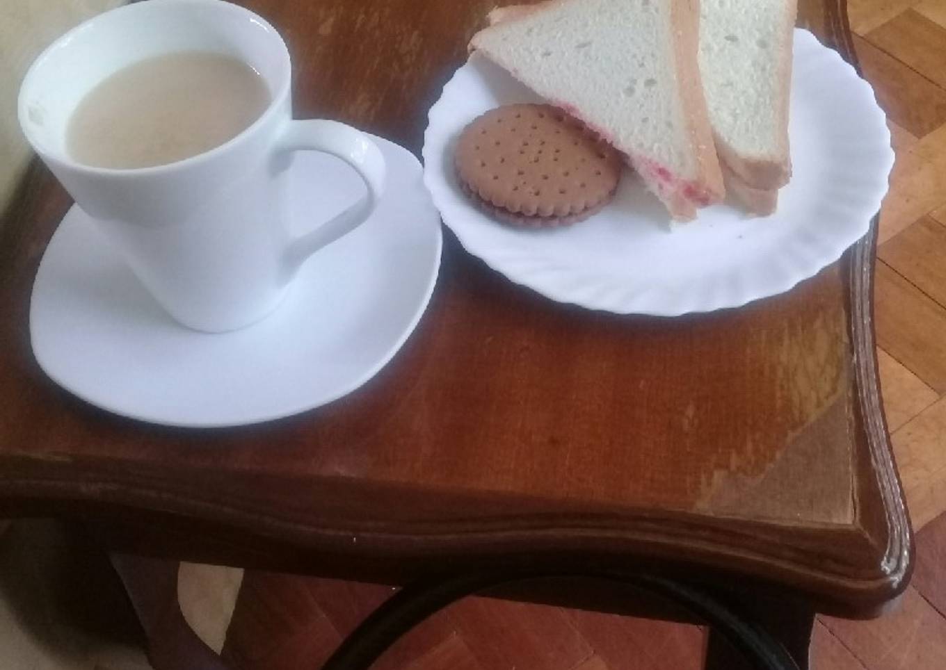 Cup of tea, slice of buttered n jam bread n a chocolate cookie